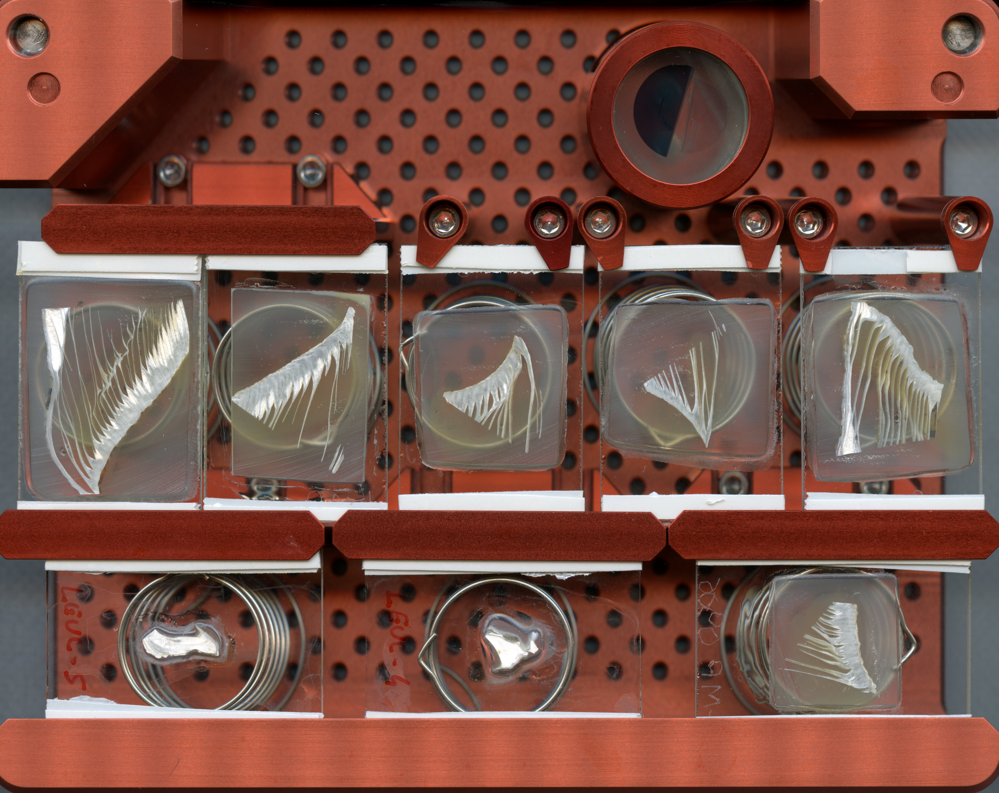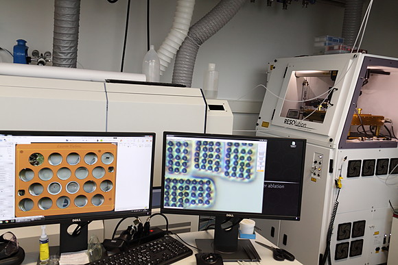 The 193 nm Ar-F excimer ablation system RESOlution SE is our most recently acquired and most frequently used ablation system. It is equipped with a highly automated, 2-vol. ablation cell S155 that offers a number of advantages: 1) simple and efficient navigation; 2) low flicker and fixed-frequency signal noise; 3) absence of position effect; 4) minimal cross-talk and fast wash-out; 5) possibility to mount a number of samples at a time using an appropriate sample holder. Both spot- and raster-mode analysis is possible. Pre-programming of ablation sites and subsequent automatic acquisition of data is the commonest way to employ this system.